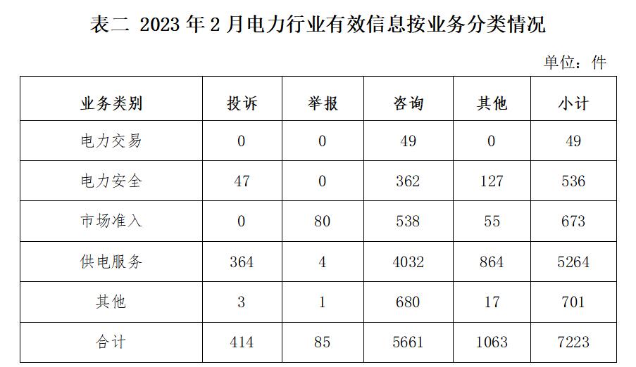 電力行業(yè)排在首位,有效信息數(shù)量為7223件,占全部有效信息的70.37%。群眾關(guān)注的內(nèi)容主要集中在供電服務(wù)、電力安全、成本價(jià)格和收費(fèi)等方面。(2023年2月電力行業(yè)有效信息按業(yè)務(wù)分類(lèi)情況見(jiàn)表二)