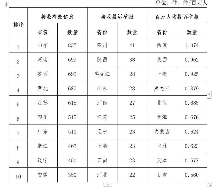 各?。ㄗ灾螀^(qū)、直轄市)按照接收的有效信息數(shù)量排序,山東、河南、陜西、河北、江蘇、四川、廣東、浙江、遼寧、安徽排在全國(guó)前10位;按照接收的投訴舉報(bào)數(shù)量排序,四川、陜西、黑龍江、山東、河南、江蘇、遼寧、上海、云南、河北排在全國(guó)前10位;按照百萬(wàn)人均投訴舉報(bào)數(shù)量排序,西藏、陜西、上海、黑龍江、北京、青海、內(nèi)蒙古、吉林、天津、甘肅排在全國(guó)前10位。(2023年2月有效信息及投訴舉報(bào)排名前10位情況見(jiàn)表三)